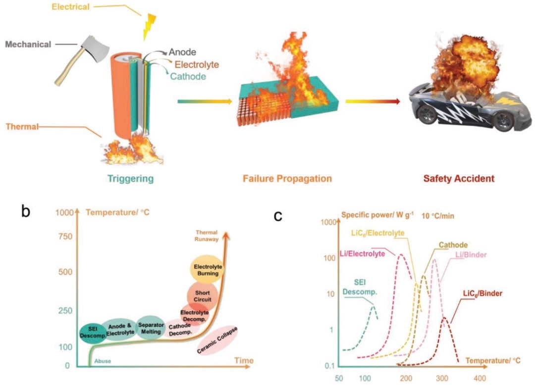 一般来说,电池在极端条件下引起的热失控会导致连锁反应。如图1a所示,当内部电池受到热、机械或电气滥用时,可能会导致单个电池温度失控。当单个电池失控时,会导致电池周围的温度迅速上升。热失控电池可能会进一步燃烧或爆炸,这将导致周围电池的热失控。热失控电池的蔓延可能会导致电池组的热失控。要设计更安全的锂电池,不仅需要从宏观的角度了解热失控的过程,还需要了解电池失控时的内部变化。锂离子电池中常用的热失控过程也是一种连锁反应。不同电池组分的热解温度不同。与锂离子电池相比,聚合物固态电池的热失控是不同的。正极和SEI层的热解类似于锂离子电池的热解。聚合物固态电池的热失控可以分为三个阶段。